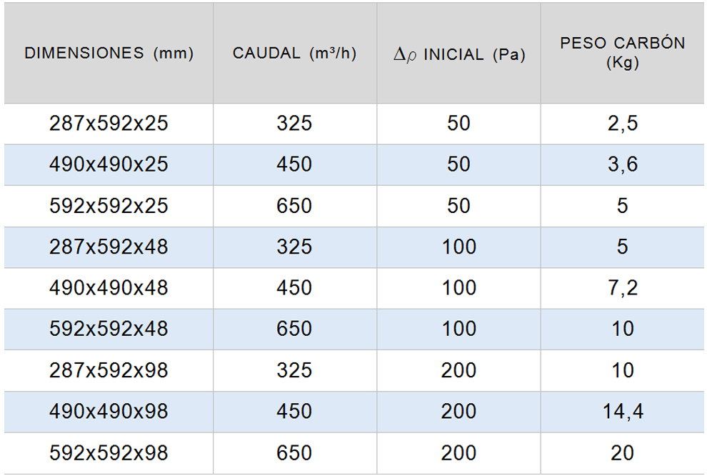 Filtro metálico construido mediante carbón granulado activado enmarcado en acero galvanizado y protegido mediante chapa perforada. Tanto en forma plana como cilíndrica. Este filtro está diseñado para la desodorización y depuración de los contaminantes gaseosos. Temperatura: 40º C. Humedad relativa: 70 %.